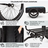 Les cyclistes, écoutez-moi ça ! Cette remorque vélo Klarfit est un vrai couteau suisse. Déjà, elle a 50 litres de volume - vous mettez deux caisses de boissons sans problème. Le châssis en acier est solide, ça supporte jusqu'à 40kg de charge. Les pneus de 16 pouces sont gonflables, avec des chambres à air standards (valve Schrader), donc facile à réparer si besoin. Le fond est étanche, et en plus y a une bâche de protection contre la pluie - pratique si vous vous faites surprendre ! Mais le plus cool, c'est que ça se transforme en chariot à main : vous détachez le timon, et hop, vous tirez votre chargement à pied. Parfait pour les courses, le camping, les balades en forêt... Les roues se démontent facilement pour le rangement. Y a des réflecteurs blancs et rouges pour la sécurité. Bref, que vous soyez un cycliste du dimanche ou un baroudeur, cette remorque va vous rendre un sacré service !
